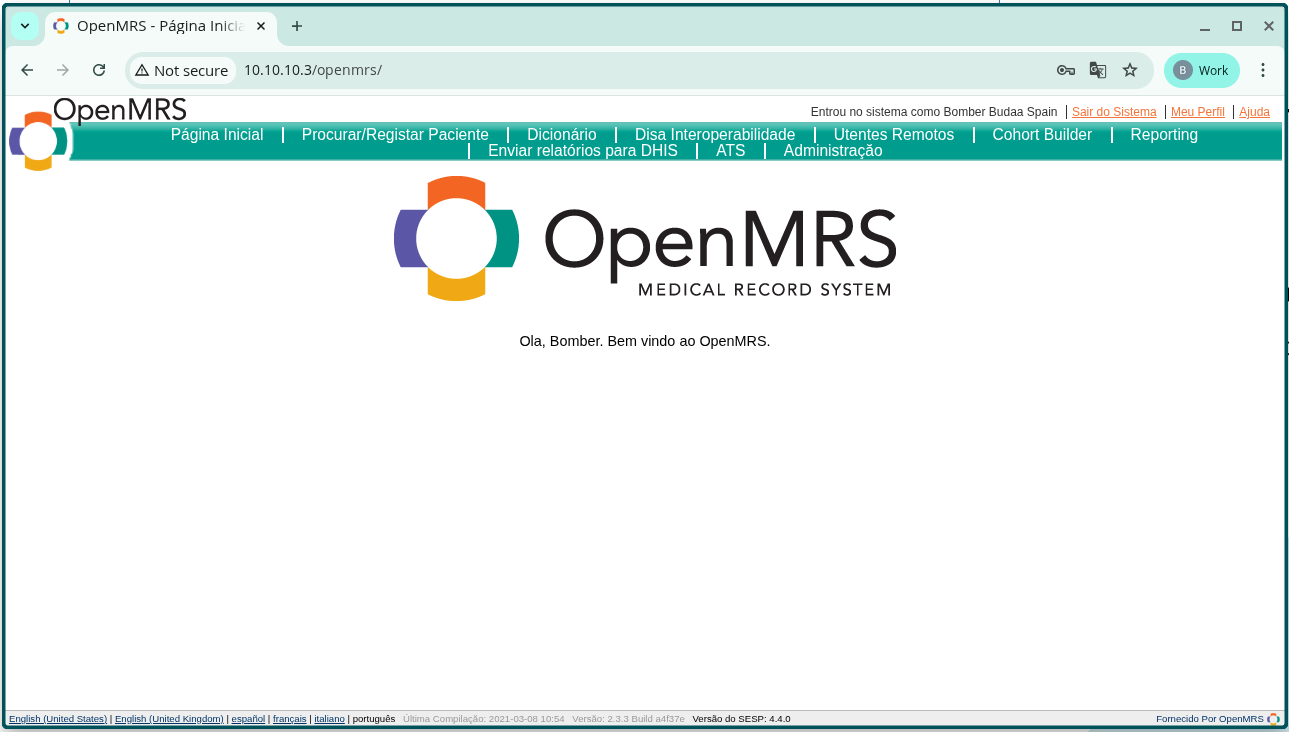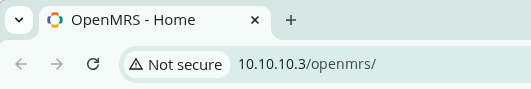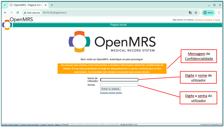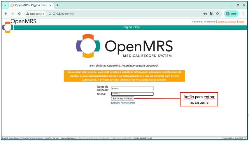 http://10.10.10.3/openmrs/ Depois de aceder ao sistema (tela de login), será solicitado que introduza as suas credenciais de acesso para para que tenha acesso as funcionalidades do sistema. Nesta mesma tela de login é também apresentada uma mensagem de alerta para confidencialidade de dados.